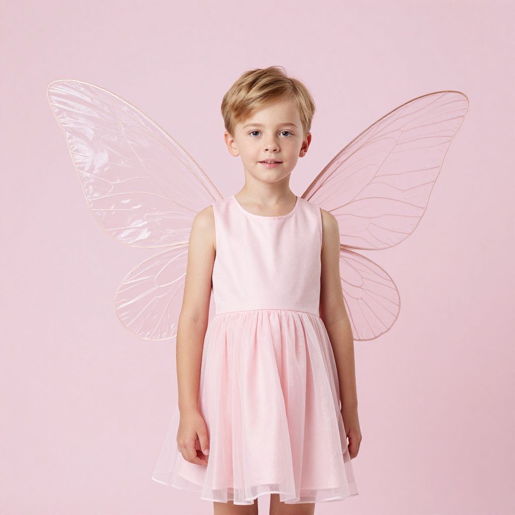 Premium pink fairy kid, solo, wings, dress, male focus, fairy, crossdressing, realistic, insect wings