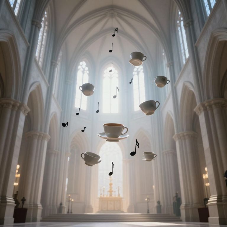 In a gravity-defying cathedral bathed in ethereal light, floating teacups dance like celestial notes, weaving a silent symphony of freedom and transcendence amidst the whispers of timelessness.