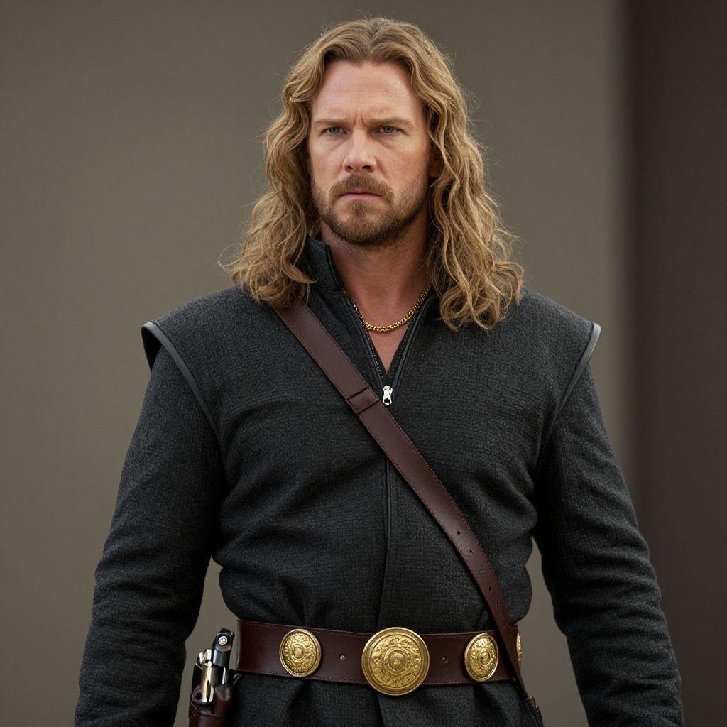 Photograph of a serious-looking man with long, wavy blonde hair and a beard. He's wearing a dark, textured tunic with shoulder pads, a brown leather belt with gold circular buckles, and a gold chain necklace. A brown strap crosses his chest, and a pistol is holstered on his right side. The background is blurred, with muted brown and gray tones.