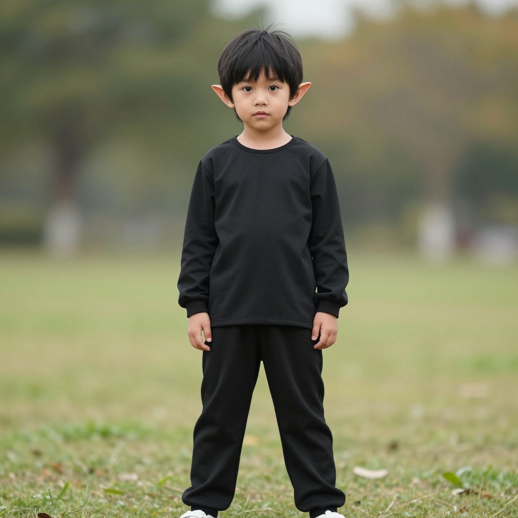 Photograph of an Asian boy with pointed ears, black hair, wearing a black long-sleeve shirt and pants, standing in a grassy park