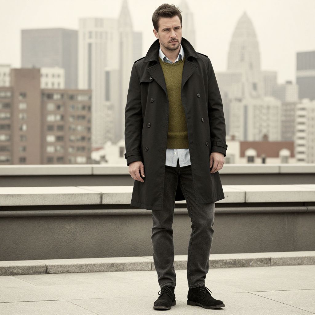 A man, charcoal trench coat, light blue chambray shirt, dark gray skinny fit jeans, black suede desert boots, olive green sweater, rooftop oasis, city skyline backdrop, sepia effect, contemplative expression Man has masculine face and piercing eyes