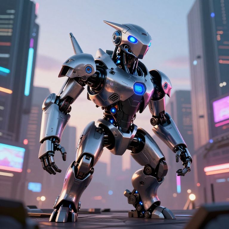 CGI image of a futuristic, metallic robot with glowing blue eyes and joints, standing in a neon-lit, cyberpunk cityscape.
