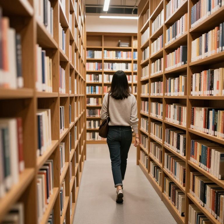 Photograph of a woman with shoulder-length dark hair, viewed from behind, walking down a narrow library aisle. She wears a beige sweater, black jeans, and white sneakers, with a brown crossbody bag. The aisle is flanked by tall wooden bookshelves filled with colorful books, extending into the background. The floor is gray, and the ceiling is visible, lit by bright fluorescent lights. The perspective creates a tunnel-like effect, emphasizing the depth of the library. The image has a slight blur on the edges, focusing on the woman's path.
