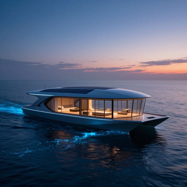 Futuristic houseboat gliding over calm ocean waters at dusk, architecture combining glass and metal with solar panels, interiors visible showing minimalist design and ambient lighting, sky filled with stars and bioluminescent waves shimmering beneath the boat for a magical atmosphere.