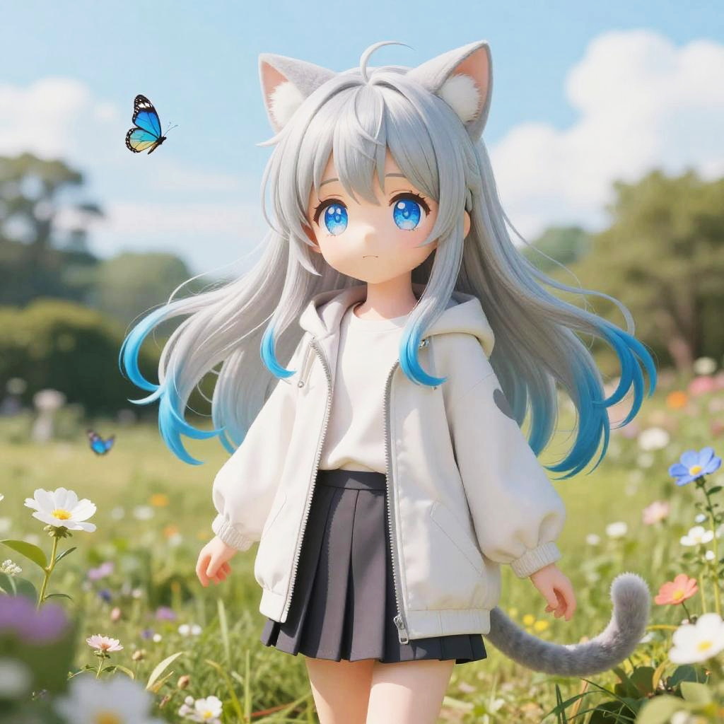 Original, (masterpiece), (illustration), (extremely fine and beautiful), perfect detailed, photorealistic, (beautiful and clear background:1.25), (depth of field:0.7), (1 cute girl with (cat ear and cat tail:1.2) stands in the garden:1.1), (cute:1.35), (detailed beautiful eyes:1.3), (beautiful face:1.3), casual, silver hair, silver ear, (blue hair:0.8), (blue ear:0.8), long hair, coat, short skirt, hair blowing with the wind, (blue eye:1.2), flowers, (little girl:0.65), butterflys flying around