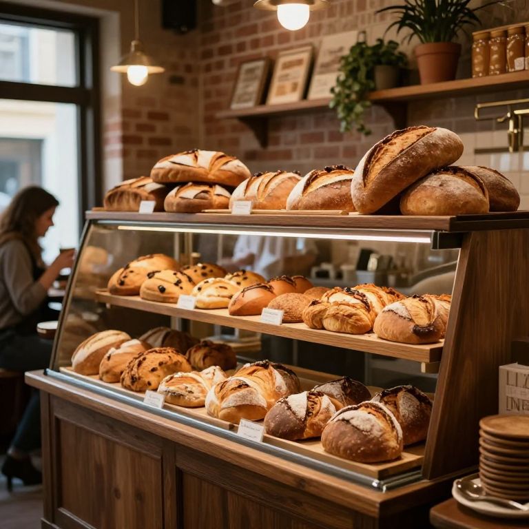 Photograph of a cozy bakery with a wooden display case filled with warm, golden-brown loaves of bread, against a brick wall background, with