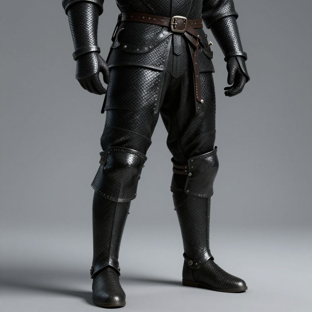 Photograph of a medieval-style armored figure from the waist down. The figure wears black, shiny, textured chainmail armor covering the torso, legs, and arms. Leather straps with metal buckles are visible on the waist and upper thighs. The arms end in black, padded gauntlets, and the legs are protected by knee guards. Black leather boots with metal studs cover the feet. The background is a smooth, gradient gray, providing a neutral backdrop that highlights the armor's texture and sheen. The image focuses on the detailed craftsmanship and materials of the armor.
