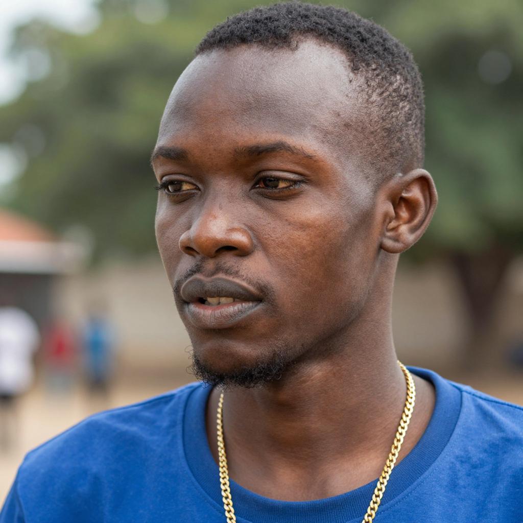 Two Black men, one in a blue patterned shirt and black cap, the other in a black shirt with white stripes. The man in the cap is bending forward, wearing a black glove, while the other man looks down, clasping his hands together. The background is blurred. The man in the cap has a goatee and short hair, while the other has short curly hair and a mustache.