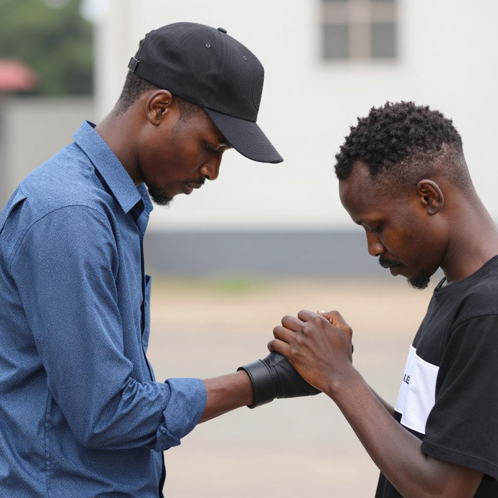 Two Black men standing closely together outdoors. The man on the left wears a blue patterned shirt, a black cap, and a black glove on one hand. He has a goatee and short hair. The man on the right wears a black shirt with white stripes, has short curly hair and a mustache. Both men are looking down, with the man on the right clasping his hands over the gloved hand of the other. The background is softly blurred.