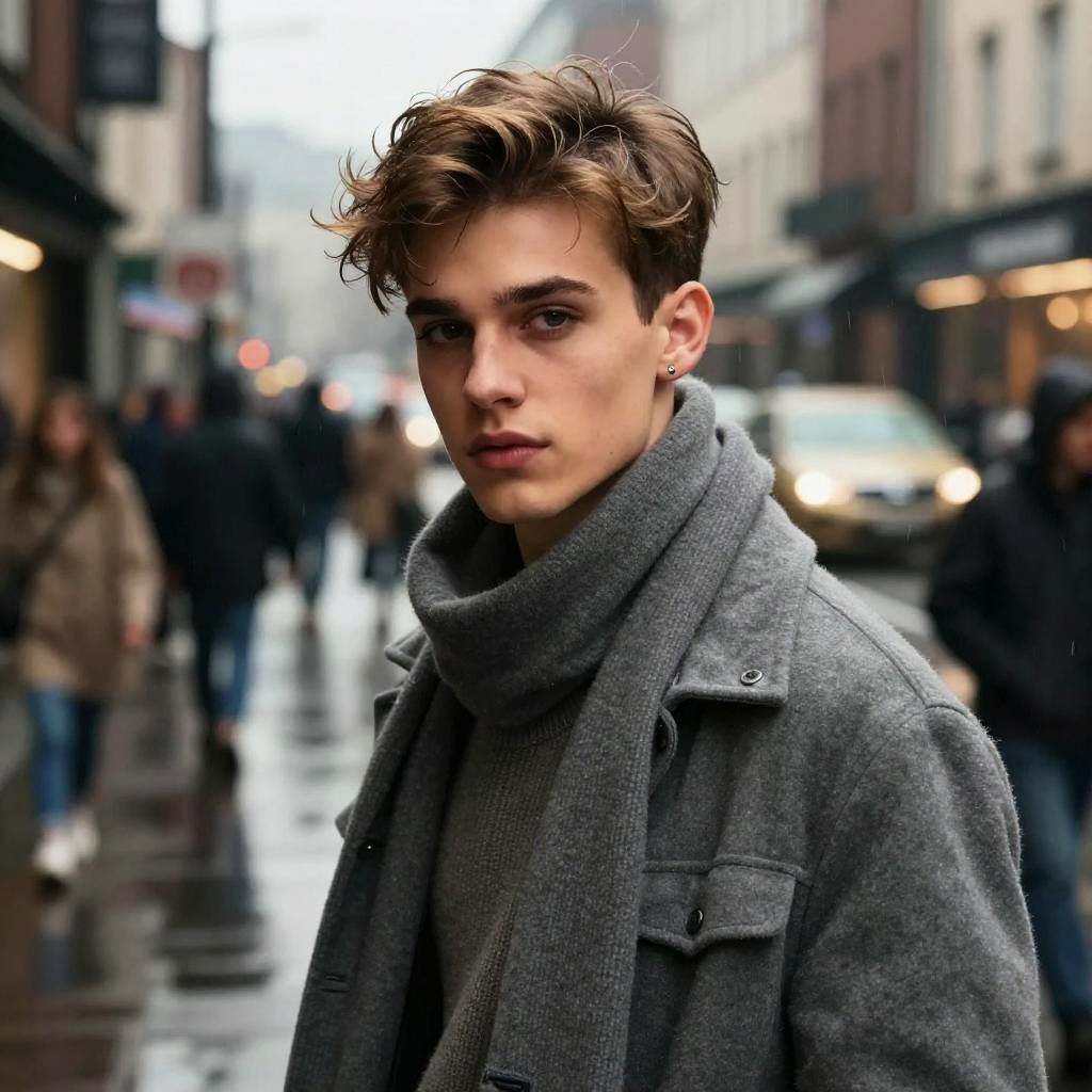 Best quality, ultra photorealistic, photorealism, 8k, photograph, photo of a young man, jacket, ear studs, gray scarf, sweater, short windswept light brown hair, fit, beautiful, (effeminate), (shaved), eyeliner, standing on the walkway, background is a crowded street, bokeh, rain, humid, overcast, artificial lights, detailed face and eyes, higly detailed skin, 8k uhd, sharp focus, professional