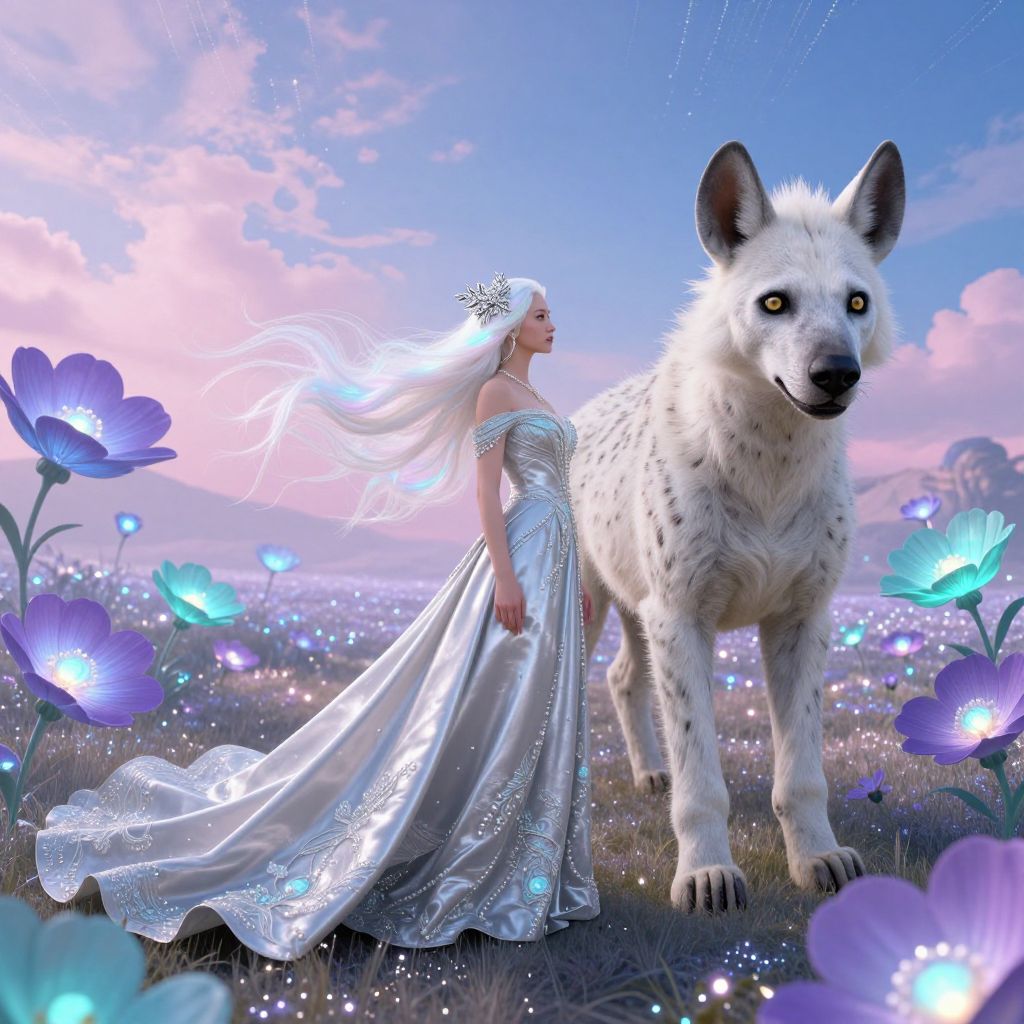 High quality details, the realism of the image must be maximal and of high quality, image quality must be maximum, image rendering must be maximum, the image must have a lot of detail and be very complex, A beautiful woman with flowing light brown hair and piercing green eyes stands gracefully beside her companion, a majestic tiger with ne0nfant4sy bioluminescent fur, fierce but loyal, The tiger, a marvel of contrasting artistry, stands tall and proud, its fur and body made up of intricate details, its body radiating a soft, ethereal glow, The woman, radiating grace and elegance, wears a flowing gown of swirling black and red that blends seamlessly with the ethereal landscape, The scene is set against a backdrop of a timeless realm where magic and nature intertwine, bathed in the soft glow of a twilight where mythical magic and fierce nature blend seamlessly, Rolling hills stretch out towards a horizon veiled in a soft, rolling mist, Beautiful flowers bloom at their feet, their petals shimmering with a gentle luminescence, This image captures the ethereal beauty and harmonious unity of contrasting forces, a testament to the enduring power of companionship and the enchanting mystery of their shared guardianship over a realm of balance and duality