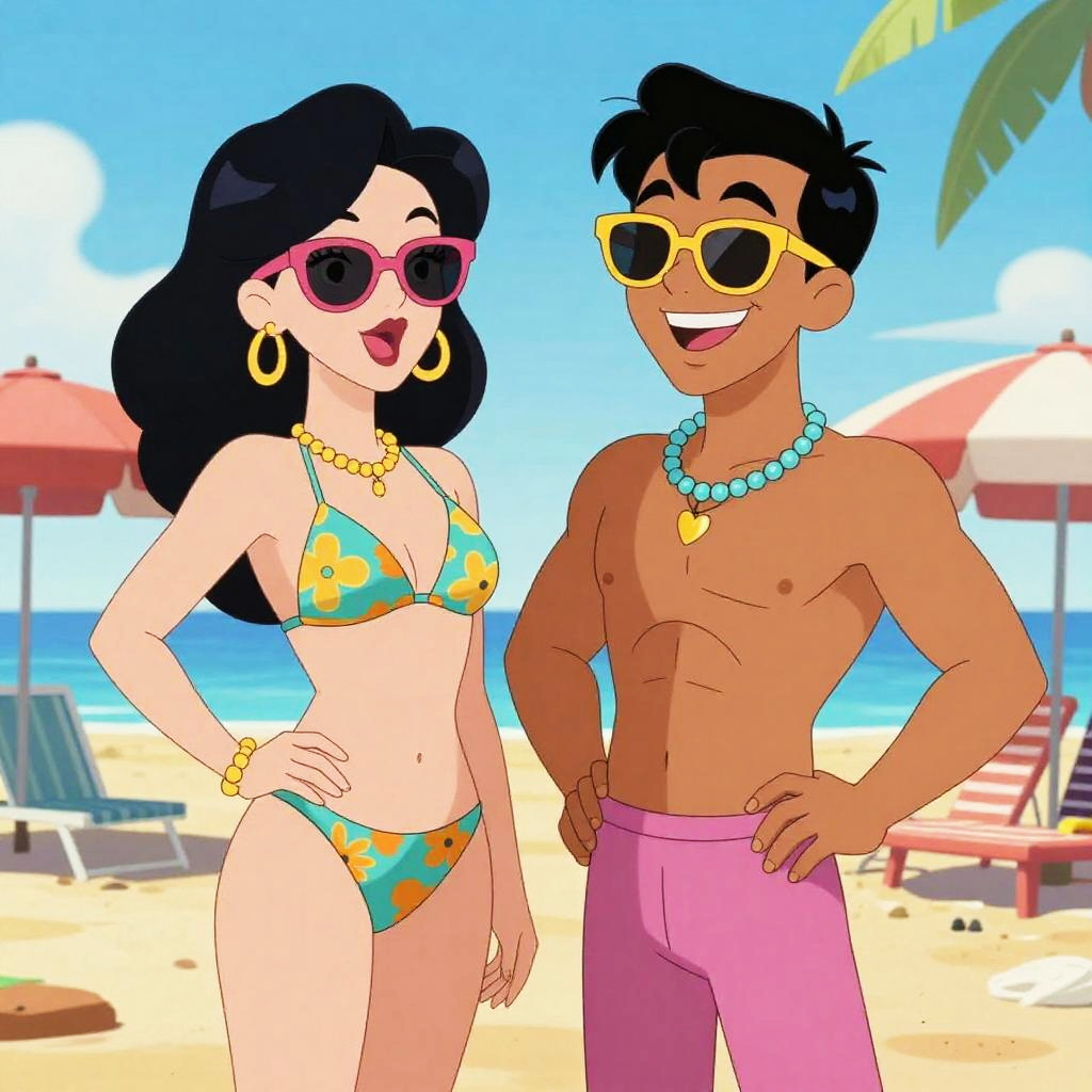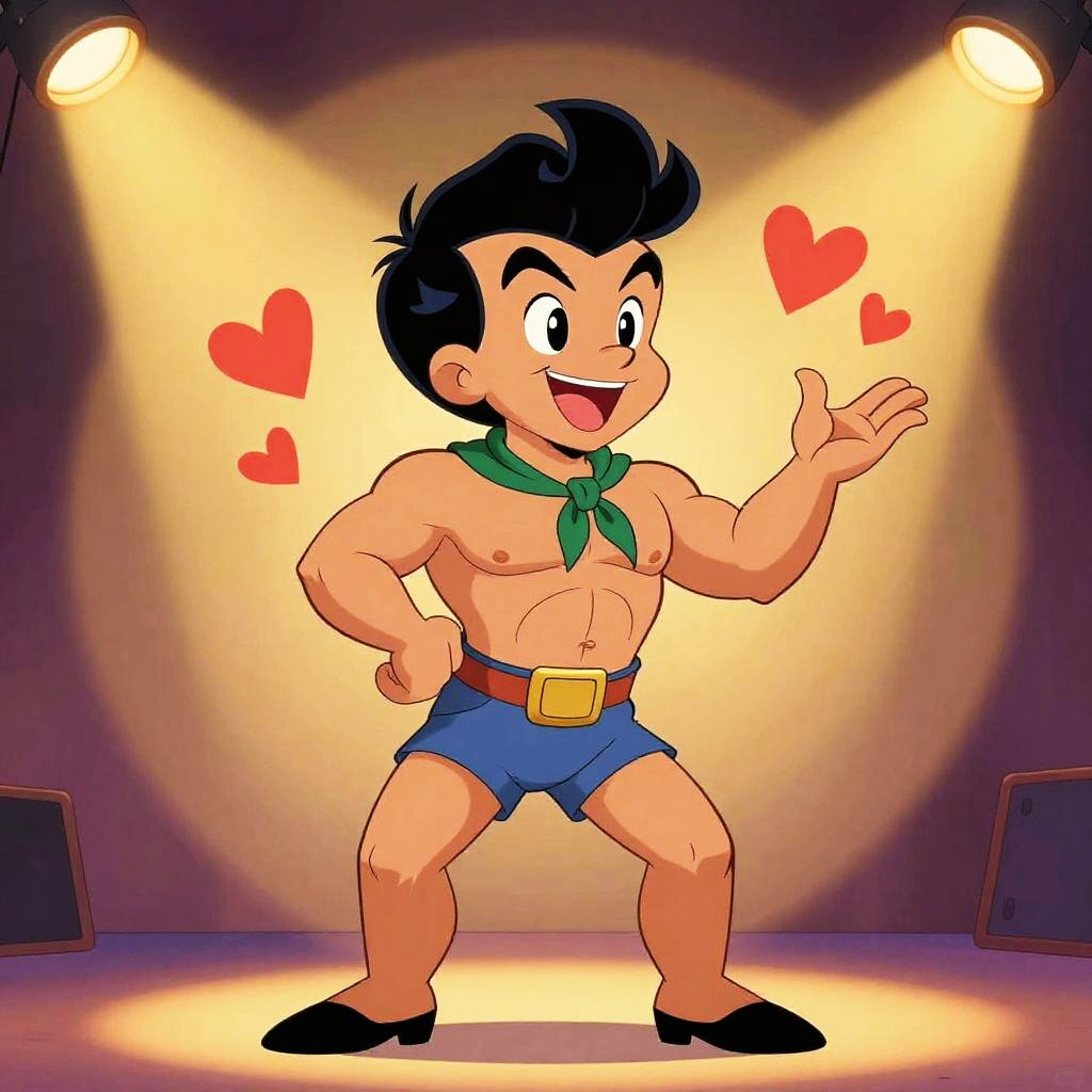 Johnny Bravo flirting on stage spotlight, stylish retro animation, strong muscular physique and signature hairstyle, cartoonish charm, animated heart symbols, vibrant warm color palette.