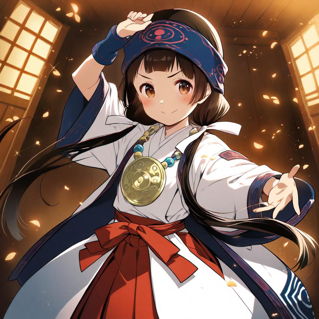 Amayadori machi, kumamiko, 1girl, brown eyes, long hair, black hair, brown hair, blunt bangs, twintails, low twintails, small breasts, hakama skirt, miko, miko, red hakama, headband, by artist ai-wa, animagine