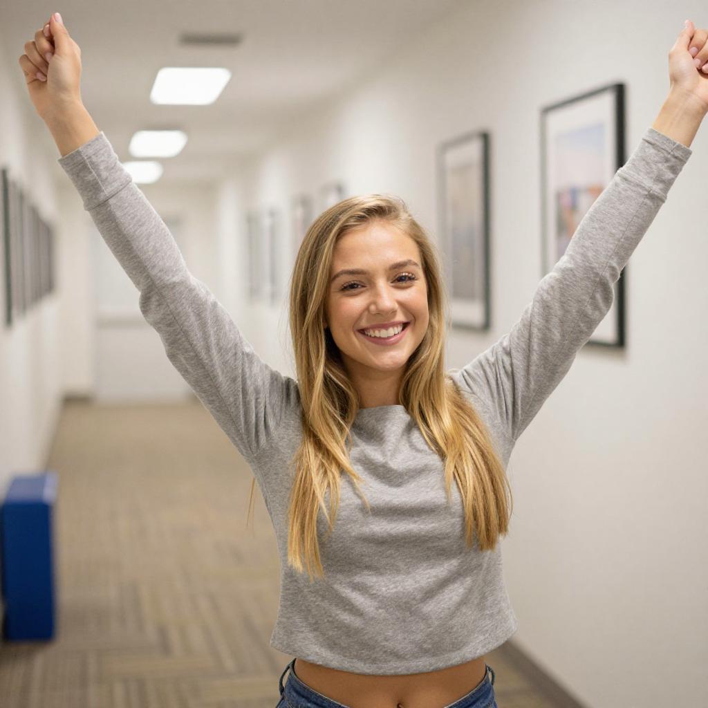 Photograph of a young woman with long blonde hair, smiling, and raising both arms excitedly. She wears a gray, long-sleeve, cropped top, revealing a bit of her midriff. She stands in a hallway with beige patterned carpet, white walls, and framed pictures. A blue object is partially visible on the left.