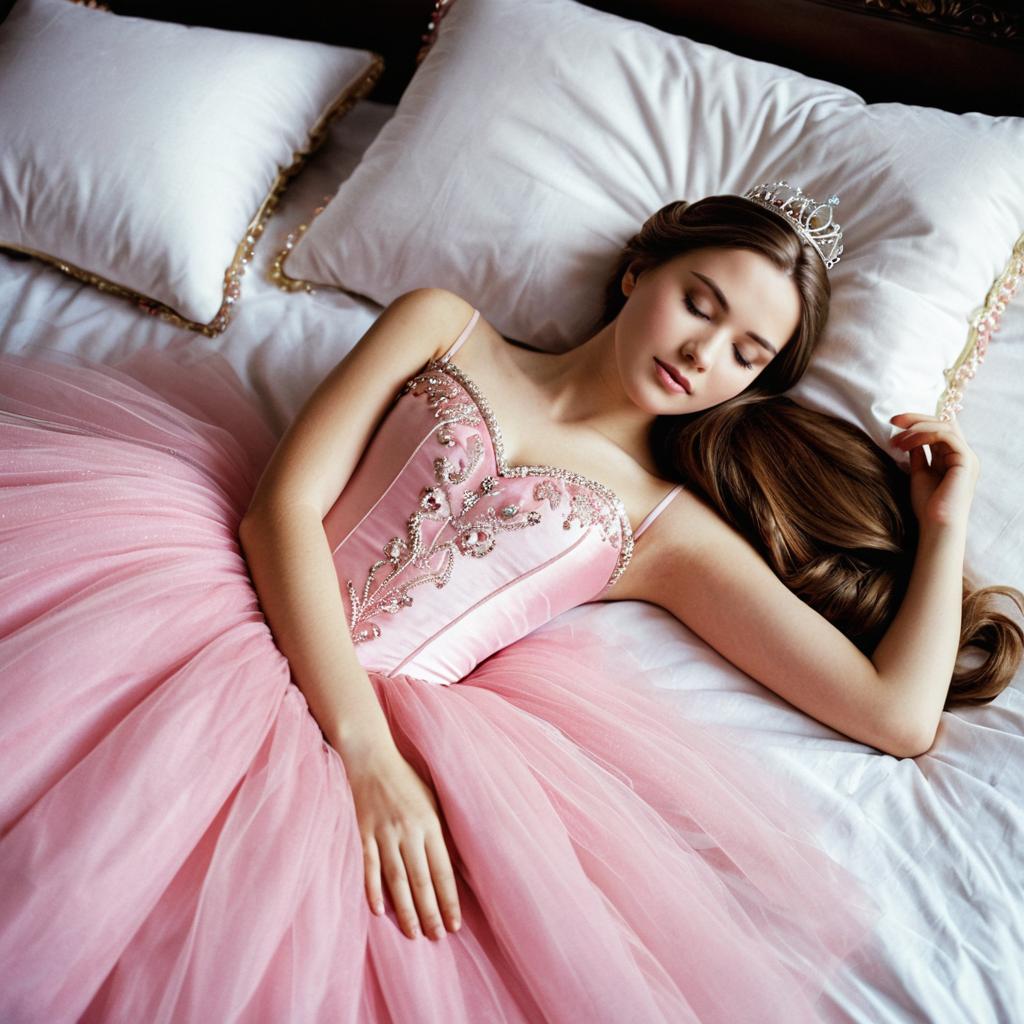 Sleeping beauty inspired,1girl, solo, closed eyes, dress, princess, pink dress, tiara, realistic, long hair, lying, on back, brown hair, bed, short sleeves, arm up, lips