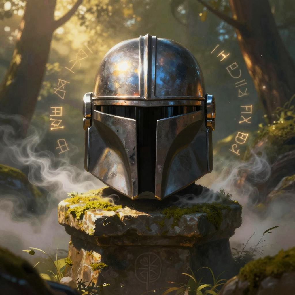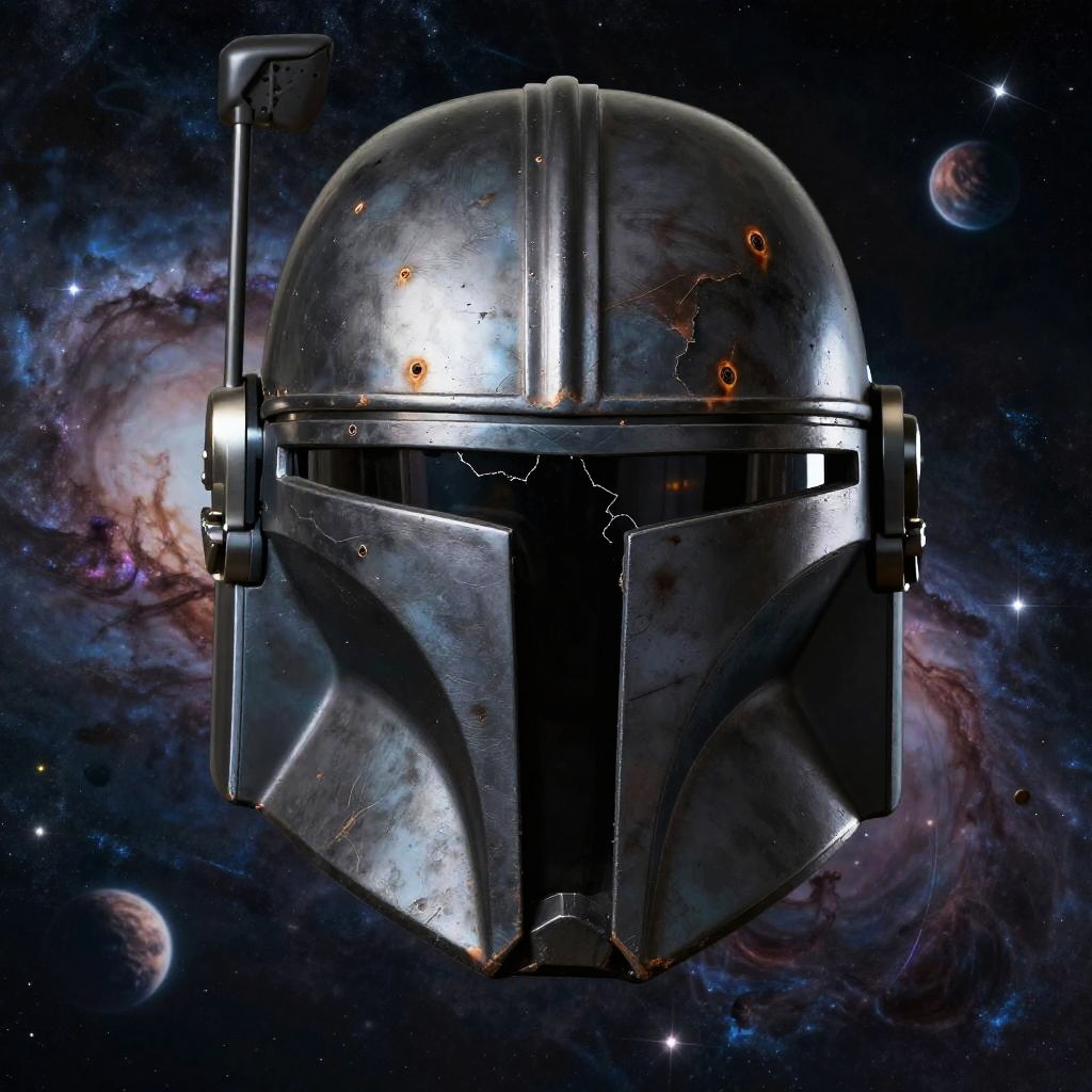 Mandalorian helmet image with a futuristic neon cyberpunk theme, vibrant colors with detailed grime and scratches, hovering over a rainy cityscape at night, reflections on wet surfaces, atmospheric smoke and glowing holograms in the background.