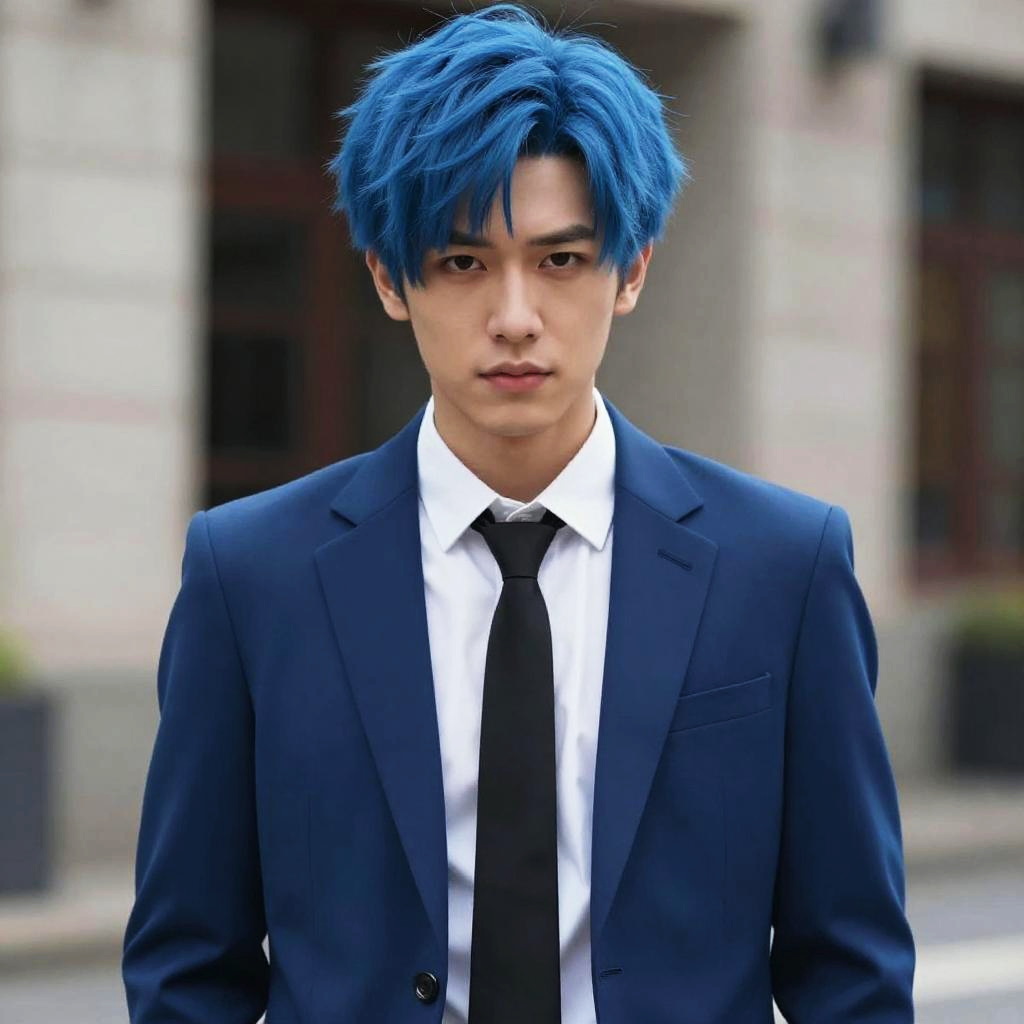 A man with striking blue hair is dressed in a sharp blue suit and black tie, embodying a cinematic realism style while cosplaying as Anya. The image captures a humorous and editorial vibe, emphasizing detailed textures and moody lighting in an urban setting.