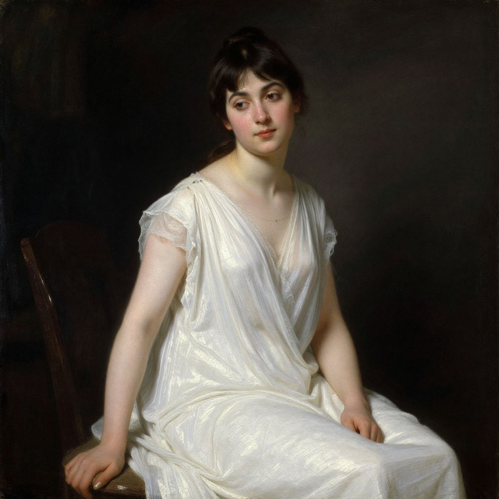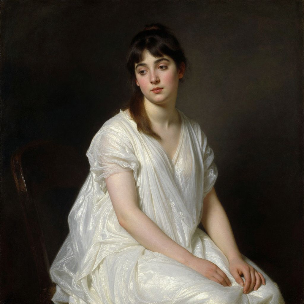 A classical oil painting by William-Adolphe Bouguereau depicts a serene young woman in a white dress, seated gracefully against a dark background, showcasing the artist's masterful use of light and shadow to highlight her delicate features and the soft texture of her attire.
