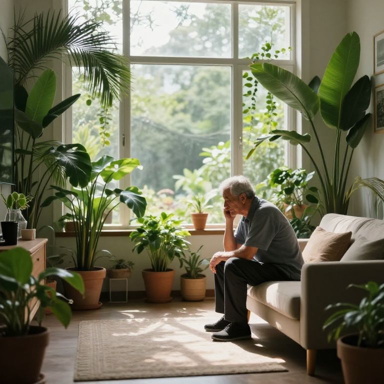 Photograph of an elderly white man with short gray hair, wearing a dark blue shirt and black pants, sitting pensively on a beige couch. He is positioned to the right, facing a large sunlit window with a green, leafy garden view. The room is filled with various potted plants of different sizes, including tall palms and broad-leafed plants, placed on the floor and a wooden table to the left. The floor has a light-colored, patterned rug. The natural light creates a peaceful, serene atmosphere, highlighting the man's contemplative expression.