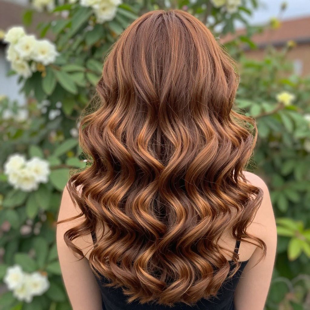 Open hair hairstyles showcasing voluminous curls falling gracefully down the back, rich chestnut tones blending with caramel highlights, styled in an outdoor garden with blooming flowers, natural and fresh ambiance, emphasizing vibrant and lively hair movement.