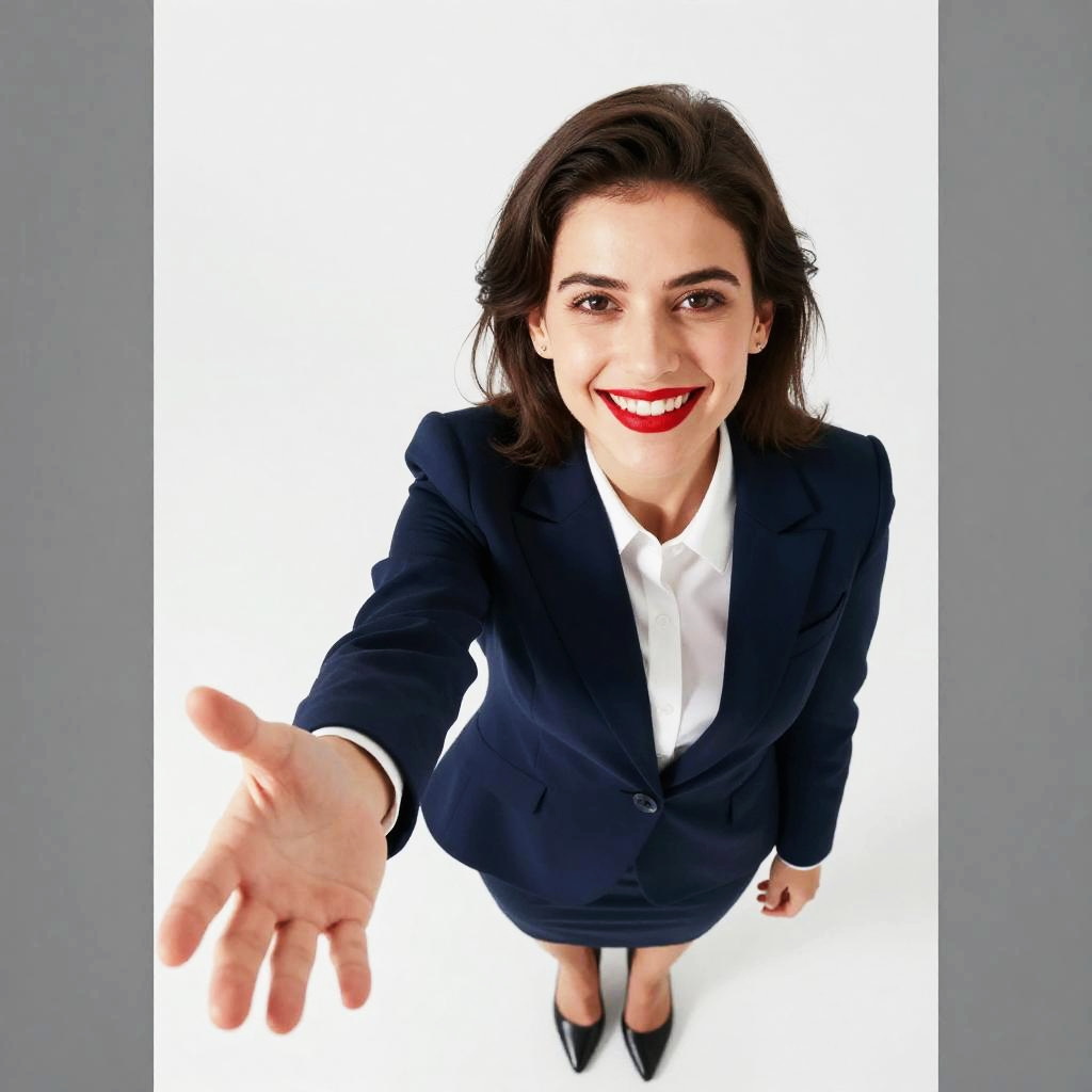 A high-angle photograph of a smiling woman with light brown skin, dark brown hair in a side ponytail, and red lipstick. She's wearing a navy blue suit with a white shirt, reaching out with a white business card towards the camera. The background is entirely white, making her and the card stand out sharply. She's looking up, with a friendly and professional demeanor.