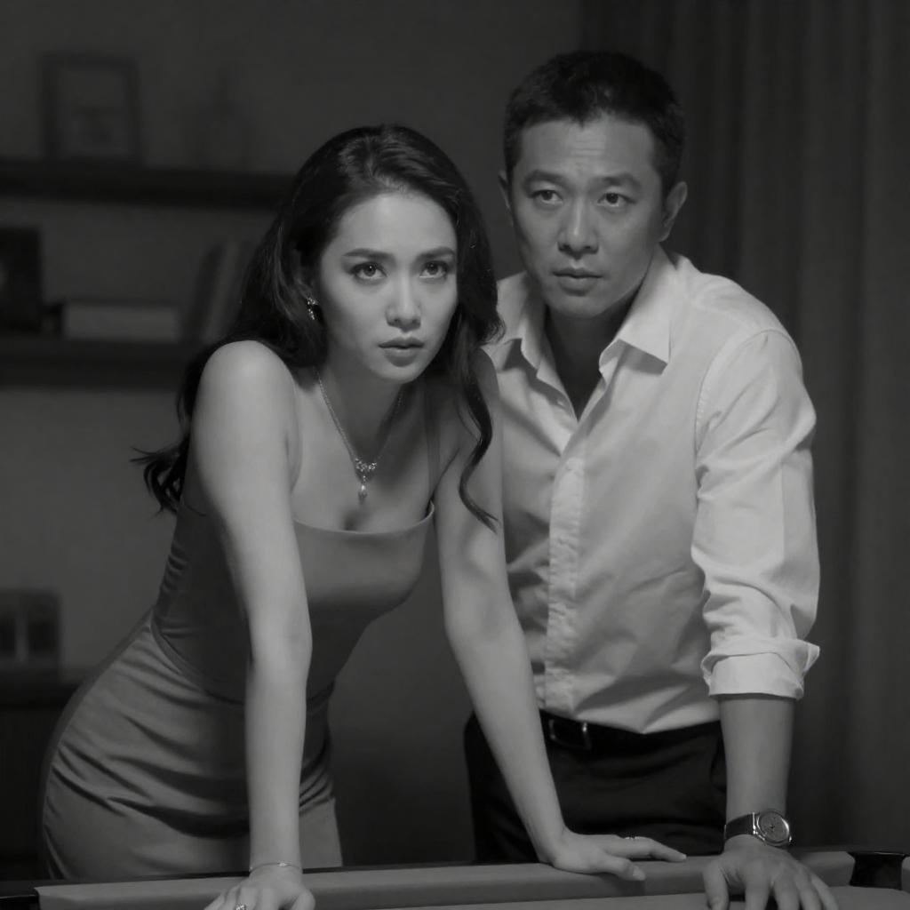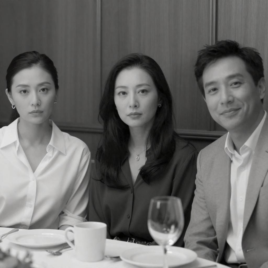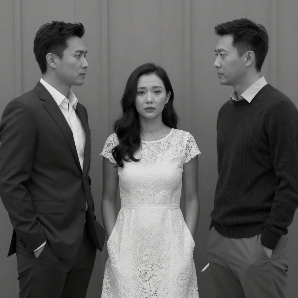 Black-and-white photograph of three people. Two men and one woman stand facing each other. Woman in white lace dress, center. Man on left in dark suit, serious expression. Man on right in dark sweater, holding cigarette, intense gaze. Background with vertical panels. Woman between men, hands in pockets.