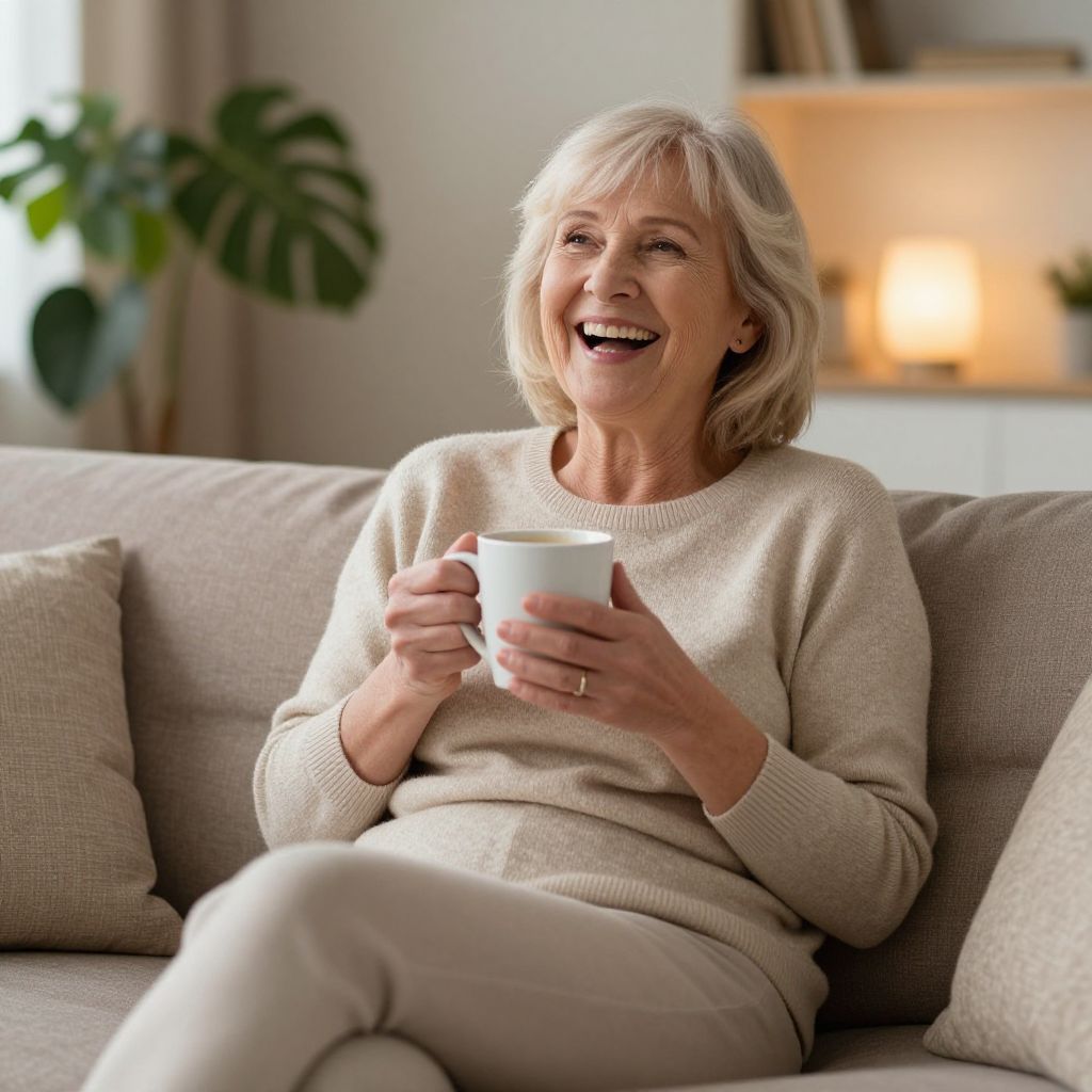 Senior woman sitting comfortably on a cozy couch, radiating joy as she holds a white mug of coffee, her laughter illuminating the warm, inviting living space adorned with soft lighting and greenery in the background.