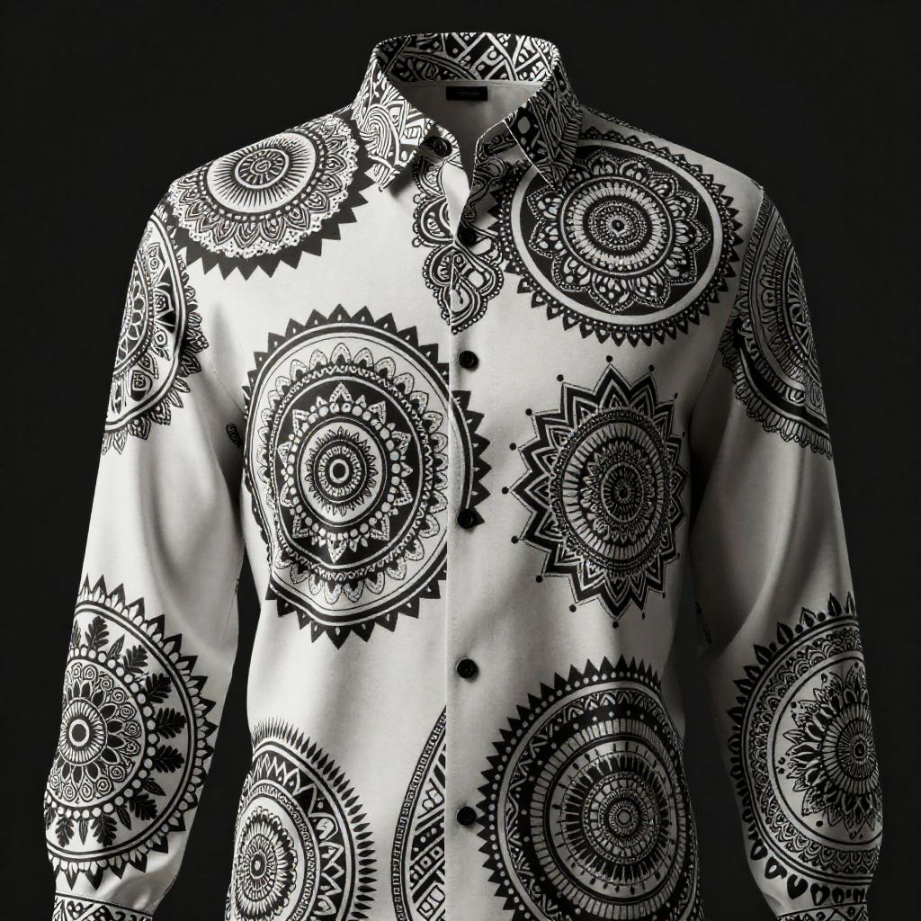 Elegant free shirt designs featuring intricate mandala and tribal patterns using monochrome palettes, displayed on smooth fabric under dramatic studio lighting, highlighting texture contrast and artisanal craftsmanship for a sophisticated appeal.