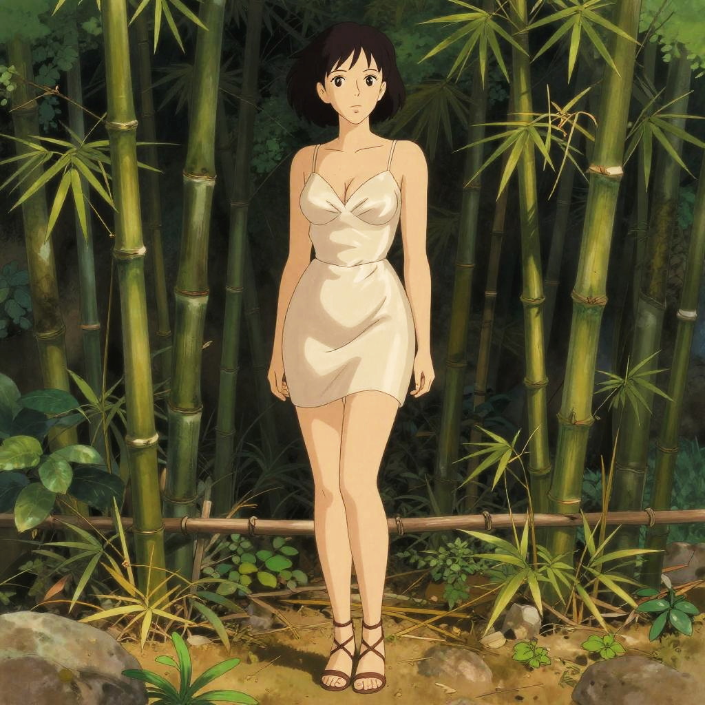 A tall woman in a champagne satin mini dress with spaghetti straps and a deep V-neckline, paired with nude strappy heels, stands in a botanical garden beside a bamboo grove, captured in a Studio Ghibli visual style. Sexy. Pretty face and beutiful eyes
