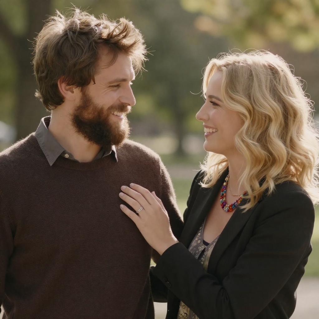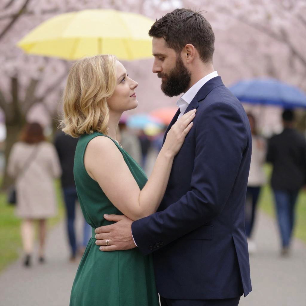 Photograph of a couple standing close in a cherry blossom garden. Woman with blonde bob, green sleeveless dress, right hand on man's shoulder. Man with dark beard, short hair, navy suit, left hand on woman's waist. Pink cherry blossoms fill background, people blurred in the distance. Yellow and blue umbrellas overhead. Woman looks up at man, man looks down at woman, both with soft expressions. Woman's left arm around man's waist. Bright daylight.