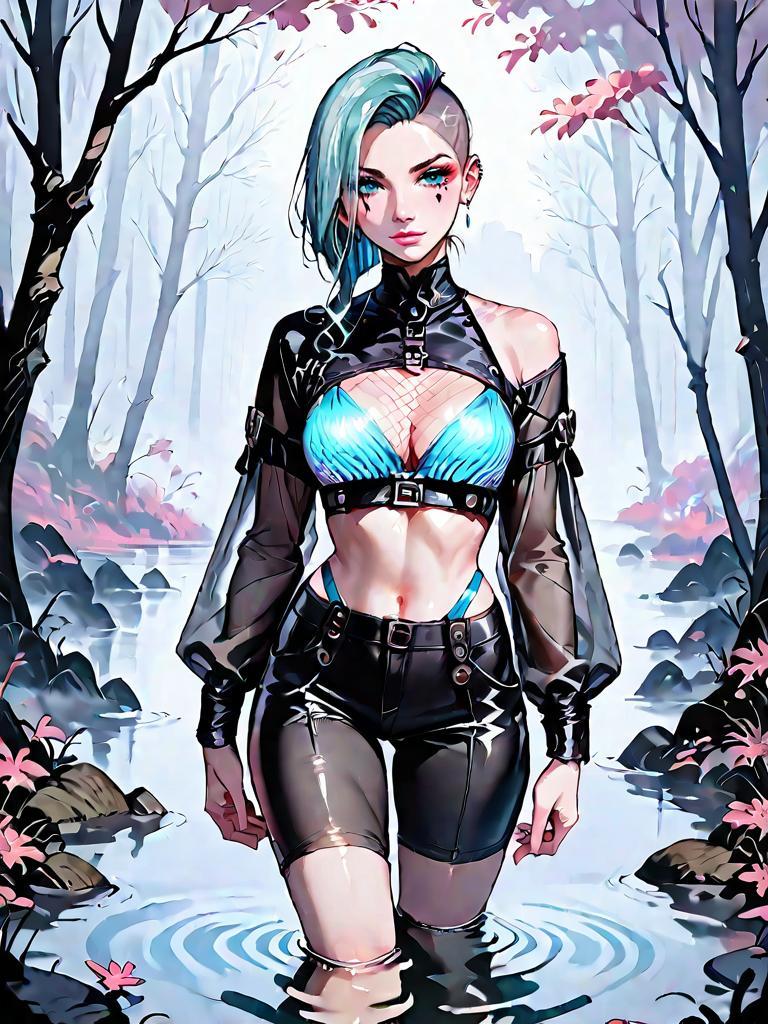 Full body, 1girl, dark_fantasy, medieval dark_forest, fog, torchlight, night mist ominous, comic Monokini, metallic silver, one-shoulder style, asymmetrical cut, shimmering fabric, reflective surface, high-waisted bikini bottom, matching silver, soft elastic material, layered with sheer mesh cover-up, long sleeves, translucent white, intricate lace detailing, oversized beach tote, canvas, navy blue, leather straps.
