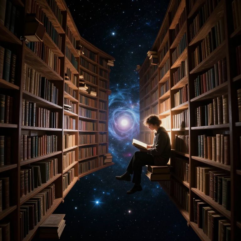 In a celestial library suspended between worlds, the glow of cosmic light illuminates ancient tomes, while solitary scholars delve into the mysteries of existence, their thoughts echoing through the void like whispers of eternity.