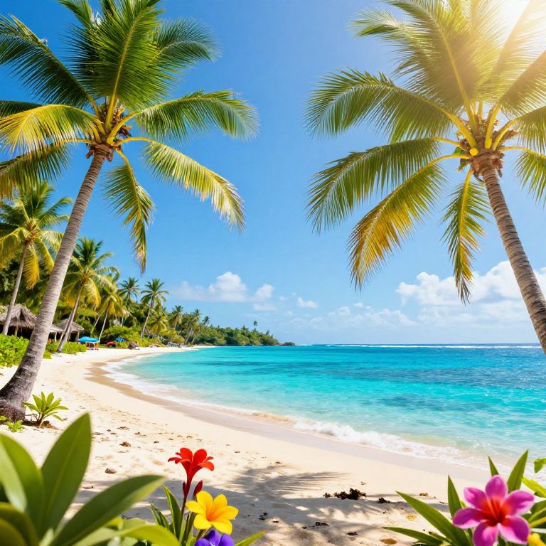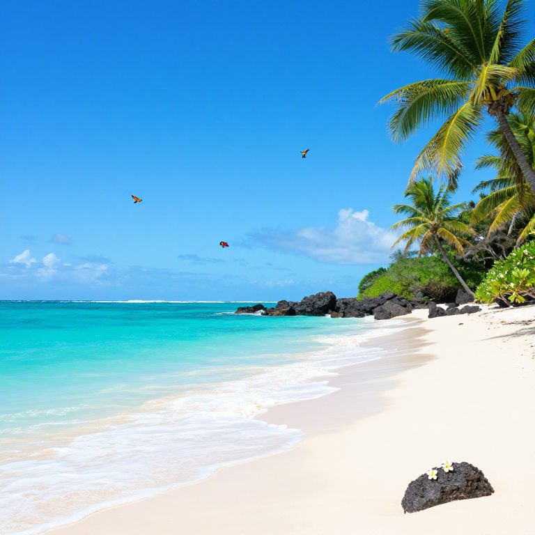 Kauai beach scene, turquoise waves gently lapping soft white sand, palm trees swaying under clear blue sky, colorful tropical birds flying, rocks dotted with blooming plumeria flowers, peaceful and vibrant island vibe, detailed and immersive