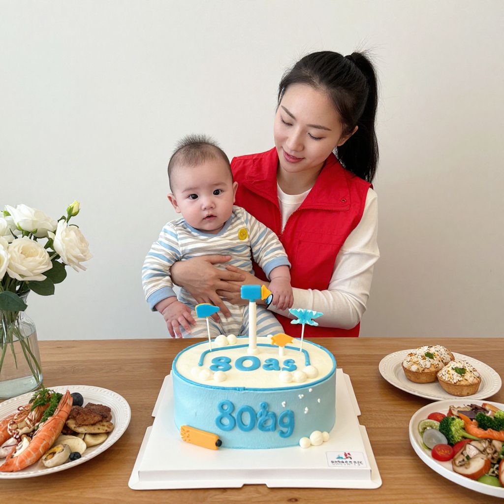 Photograph of an Asian mother with black hair in a red vest, holding a baby, celebrating the baby's 8th birthday with a blue cake