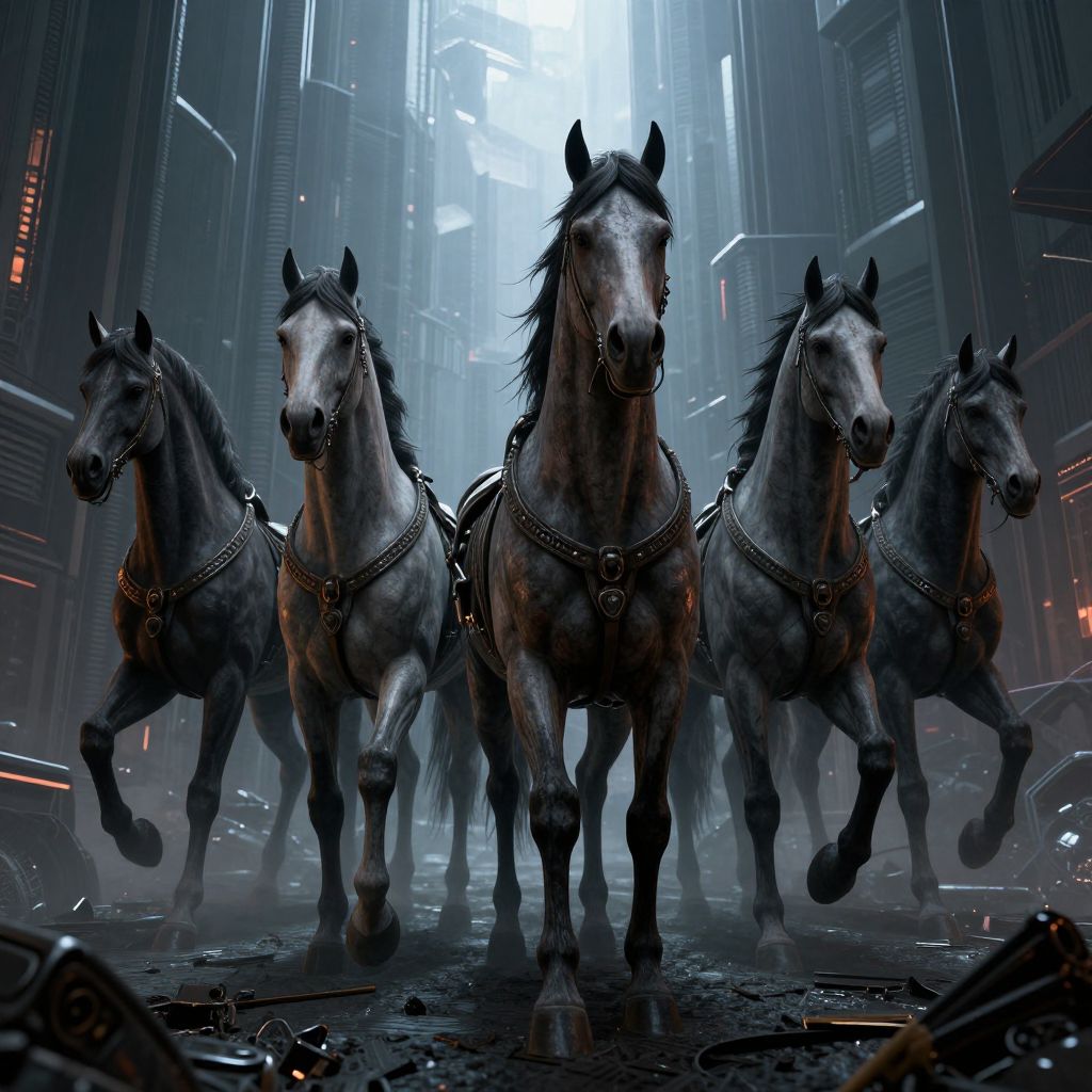 Digital art of four powerful, black horses with metallic harnesses galloping through a neon-lit, futuristic city street at night.