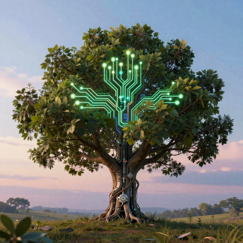 AI generate album cover depicting a surreal blend of artificial intelligence and nature, with a mechanical tree growing glowing circuitry instead of leaves, set against a dreamy twilight sky, evoking themes of harmony between technology and organic life.