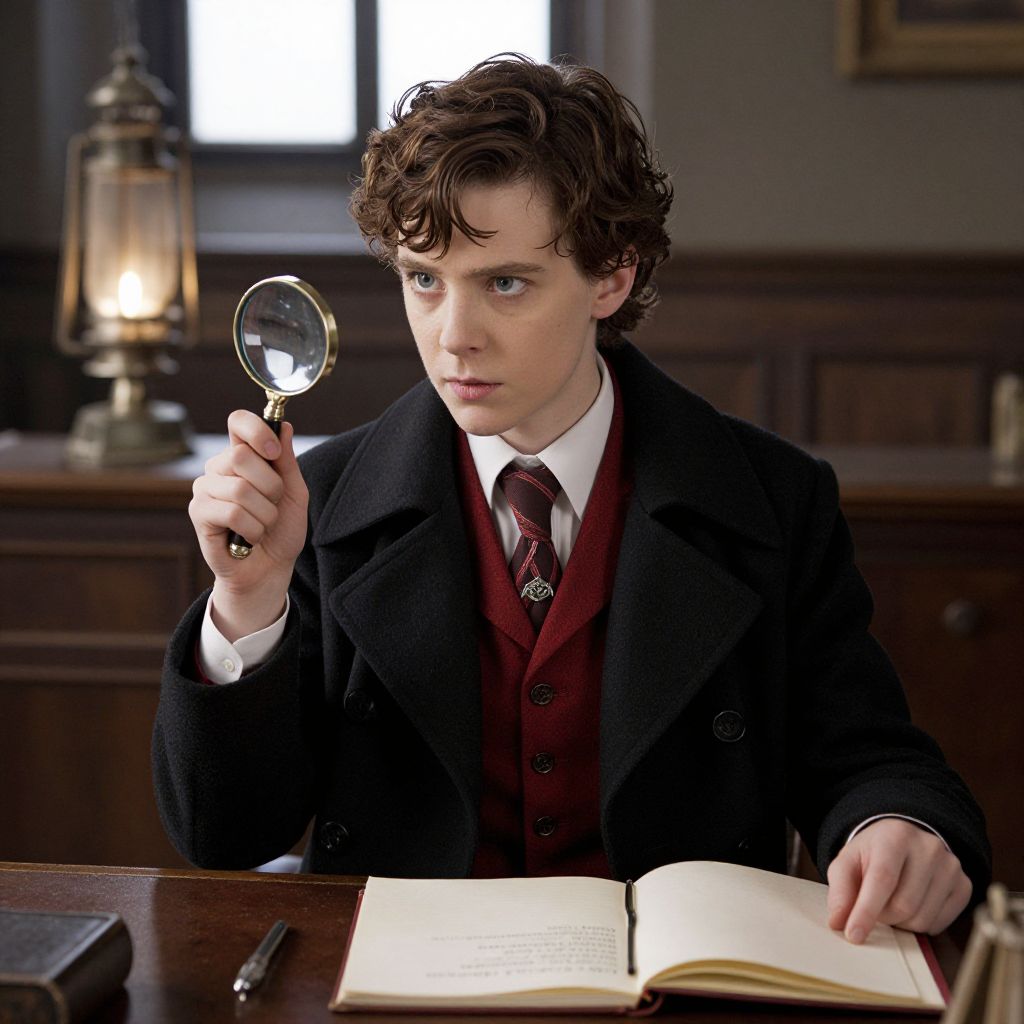 Photograph of a young white man with curly brown hair, wearing a black overcoat, white shirt, and maroon vest with a matching tie, examining an open book with a magnifying glass in a dimly lit, vintage study. He has a focused expression, and a brass lantern is visible in the background. The wooden desk in front of him holds the book, a closed notebook, and a pen. The room has dark wood paneling and a window letting in soft light. The image has a Sherlock Holmes-inspired style.
