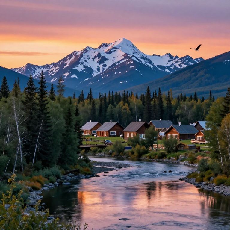 Haines village nestled in the Alaskan wilderness at sunset, snow-capped mountains in the background, lush pine forests, a calm river reflecting the sky, serene wildlife including eagles soaring, high detail, vibrant colors, cinematic lighting