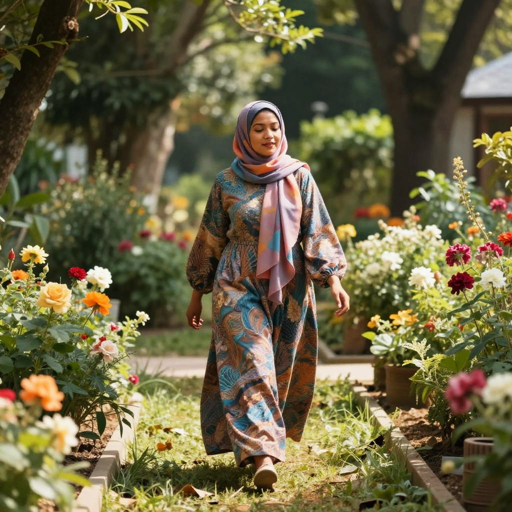 Photograph of a young woman in a white hijab and long, pale pink scarf, wearing a mauve jumpsuit, walking confidently down a sun