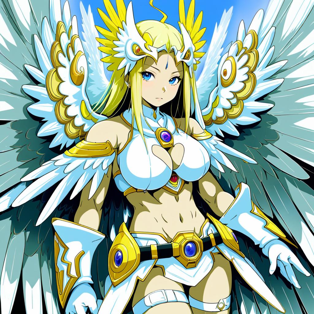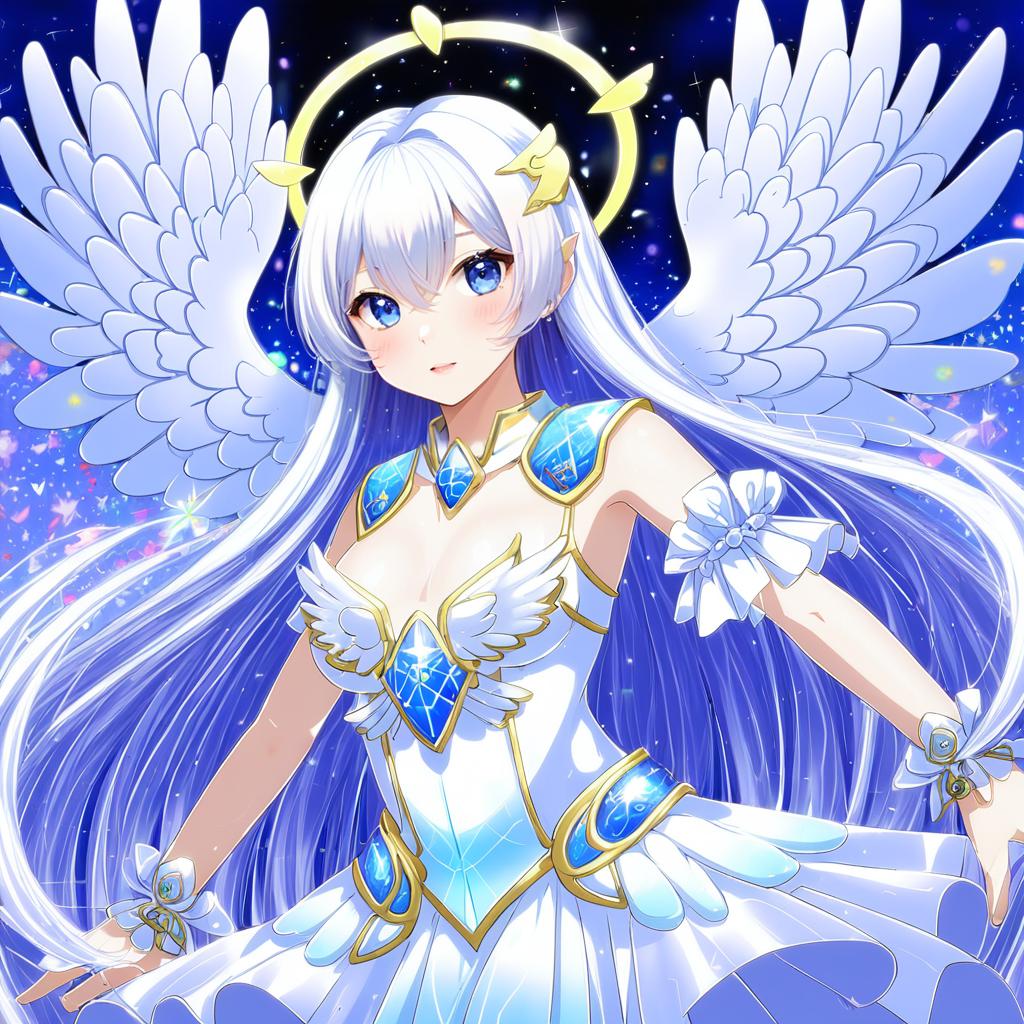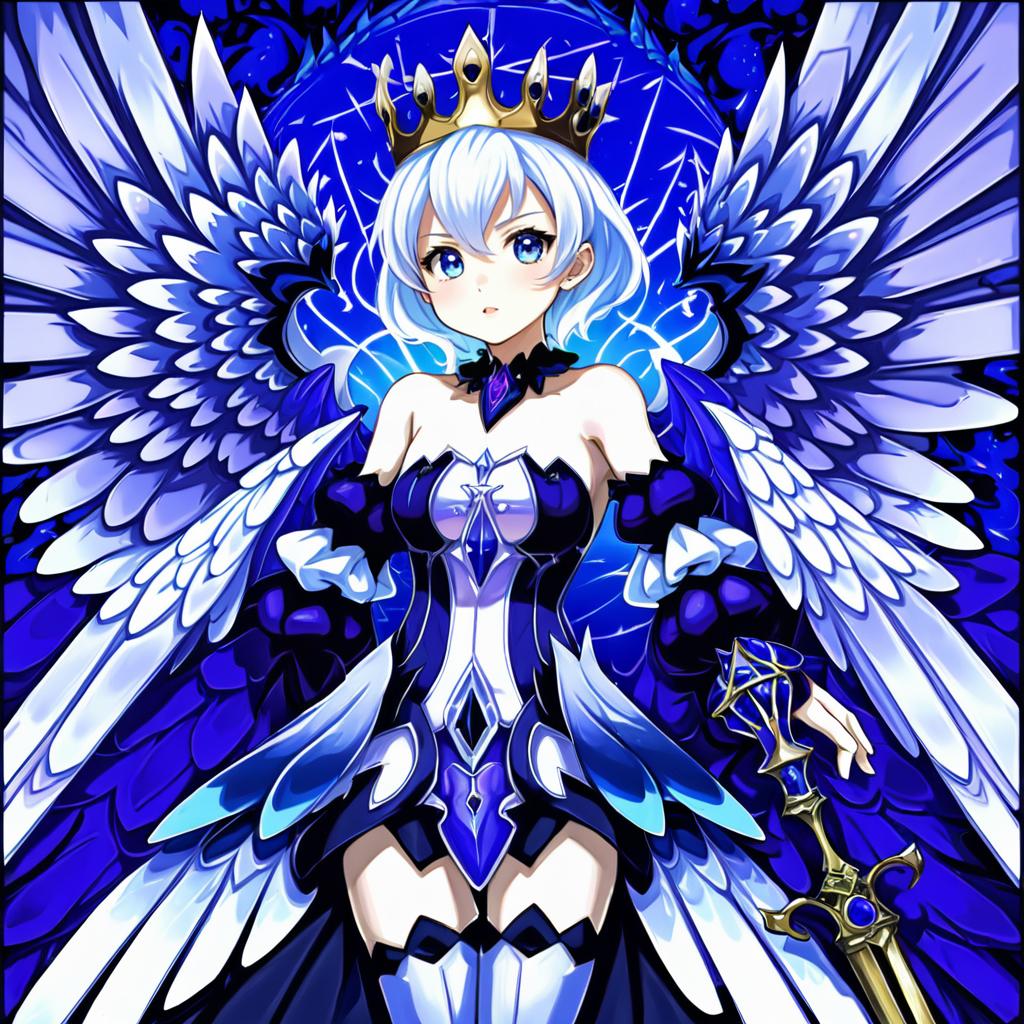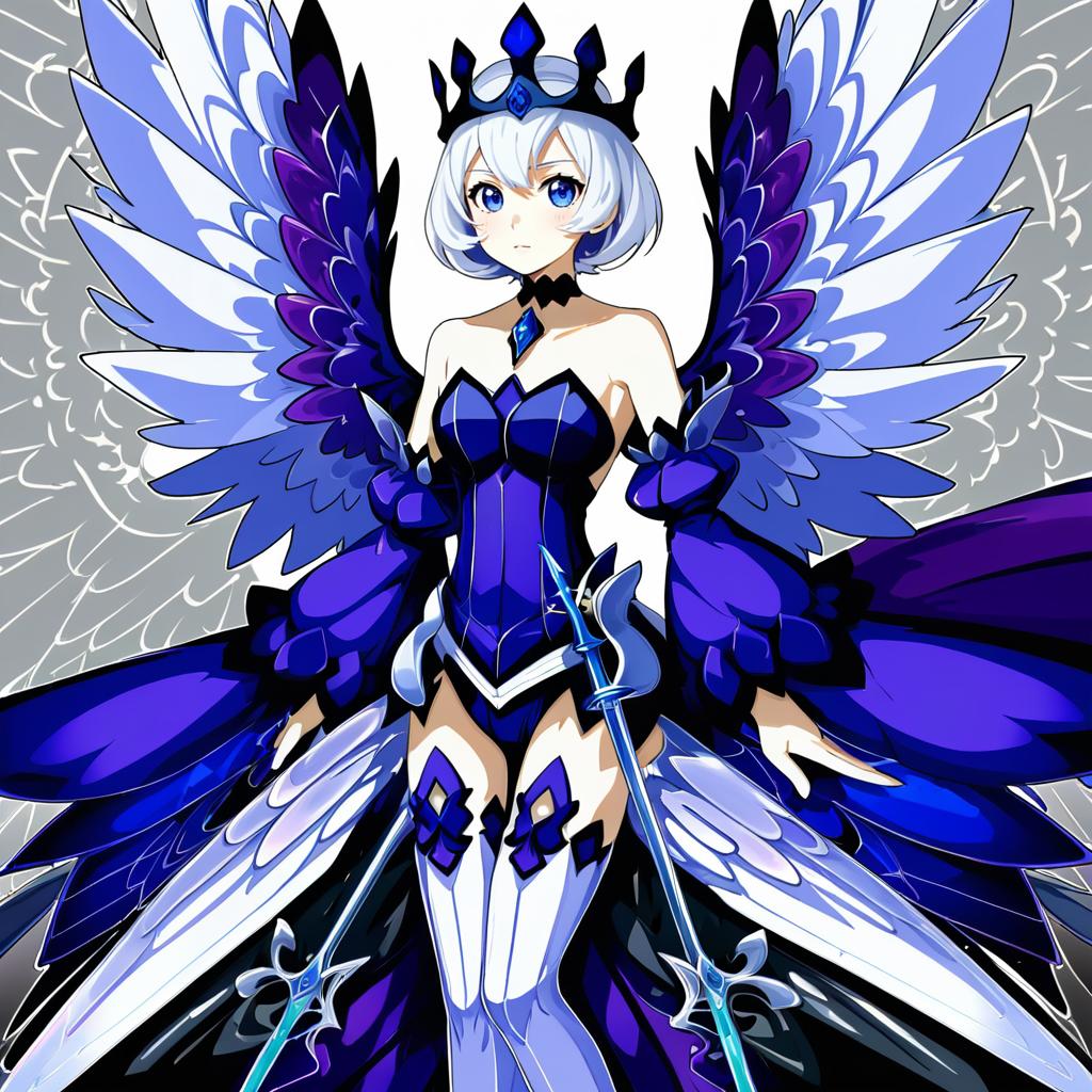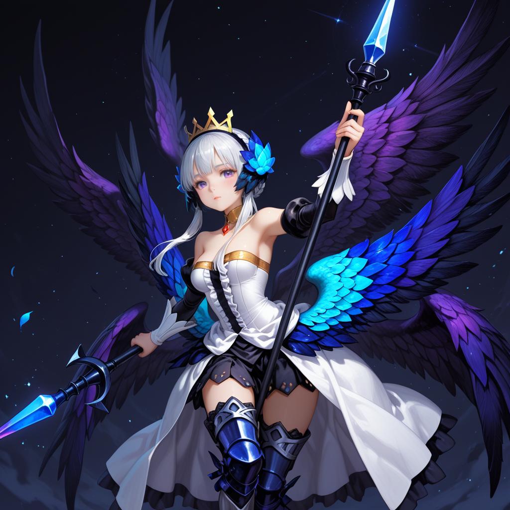 Digital anime illustration of a female angelic warrior character with short white hair and blue eyes. She is wearing an armored strapless dress with detached sleeves and thigh-high stockings, accented with a choker necklace. The character has multicolored large wings in shades of blue, purple, and white, and wears a golden crown. She holds a detailed ornate spear with gold and blue elements. The background features glowing blue patterns, emphasizing the fantasy theme.