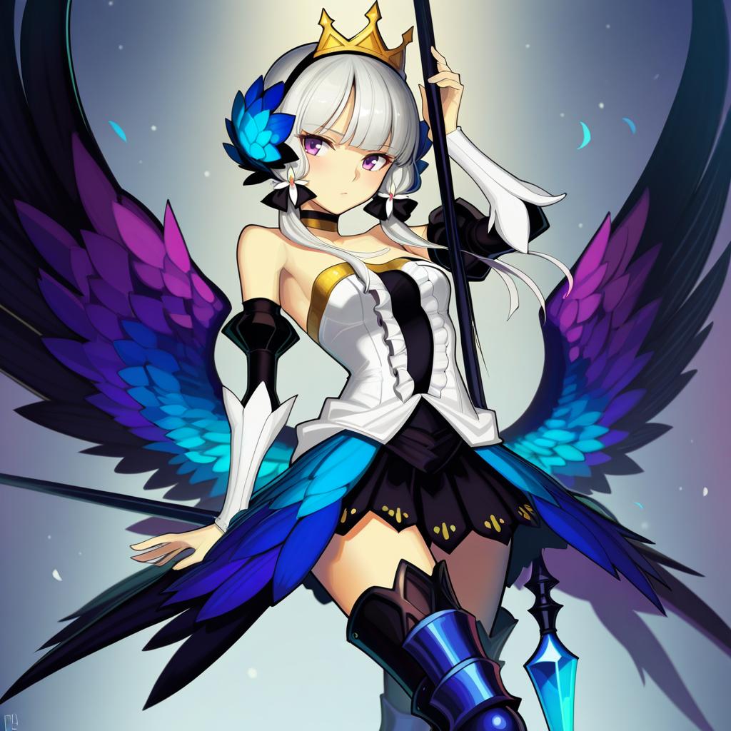 Gwendolyn (odin sphere), odin sphere, 1girl, blue eyes, purple eyes, white hair, short hair, grey hair, strapless dress, armored dress, thighhighs, bare shoulders, detached sleeves, choker, multicolored wings, low wings, multiple wings, spear, crown, by artist moisture (chichi), anime