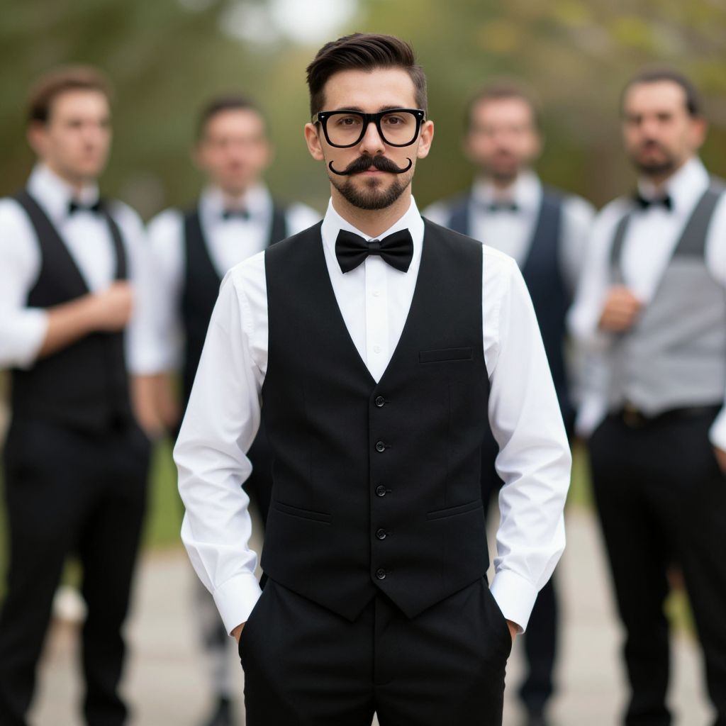 Funny bachelor party costume, male focus, shirt, facial hair, vest, hands in pockets, white shirt, 1boy, bow, glasses, bowtie, pants, black bow, mustache, blurry background, black pants, blurry, short hair, solo focus, looking at viewer, black bowtie, black hair, multiple boys, beard, outdoors, collared shirt