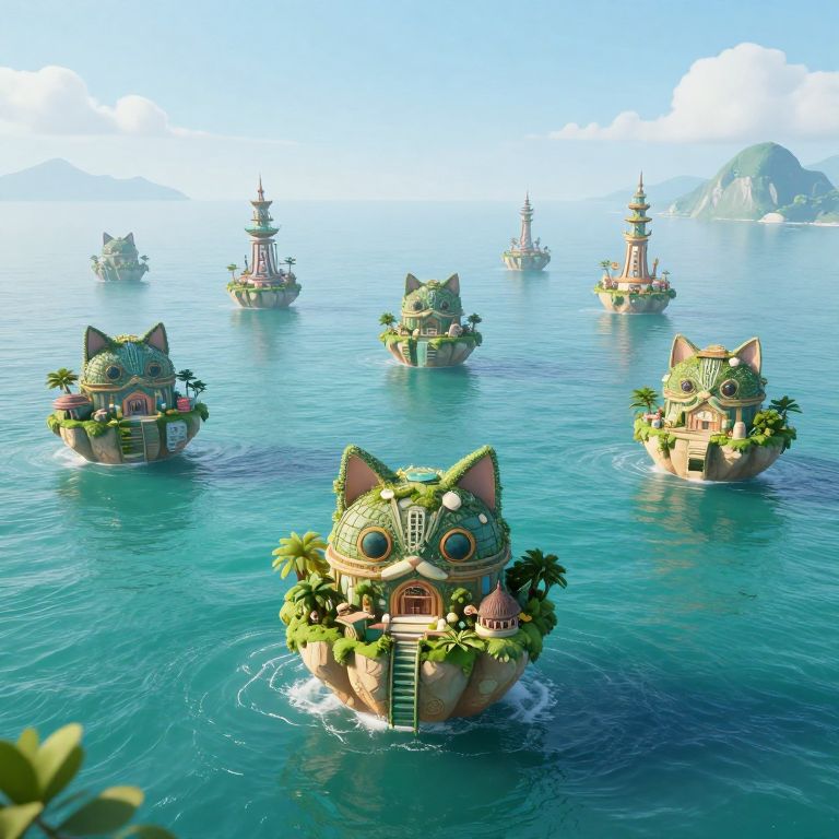 A serene 3D-rendered seascape features cat-shaped islands floating on a tranquil turquoise ocean, each adorned with ancient, gravity-defying structures and lush greenery, evoking a fantastical, high-definition digital art vision of a unique civilization adapted to their feline-shaped homes.