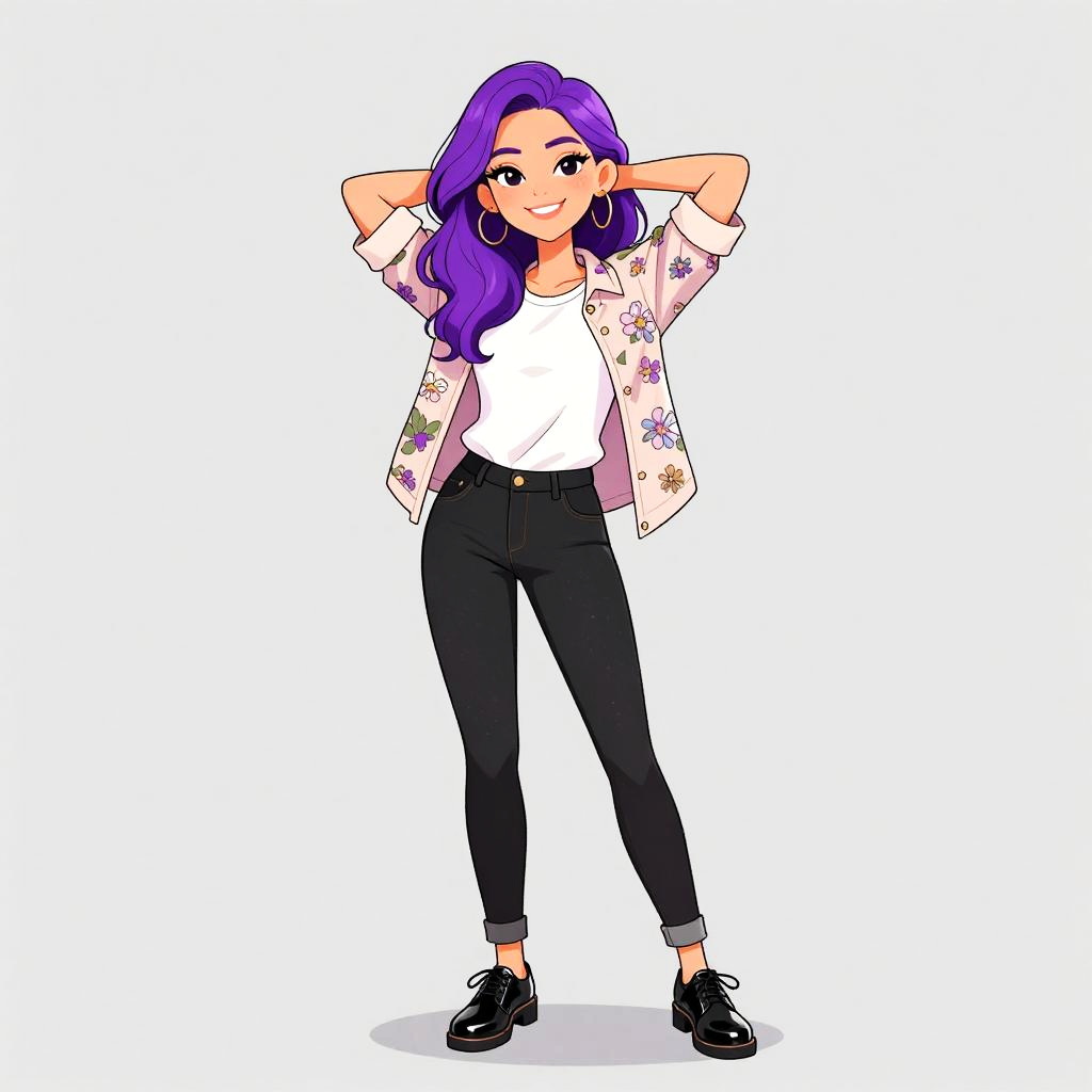 Digital anime-style drawing of a confident woman with purple hair, wearing a floral jacket, white tee, black pants, and black shoes.