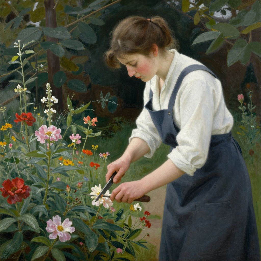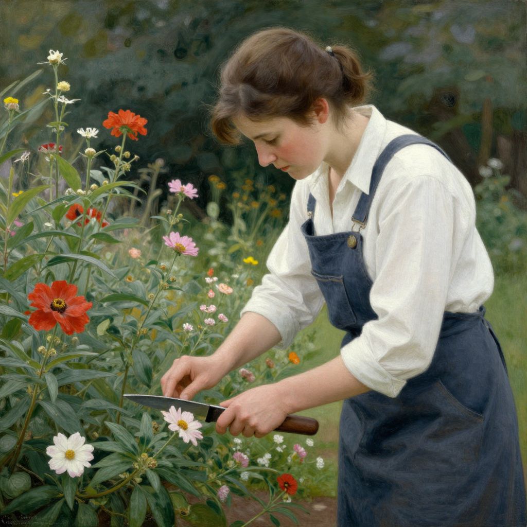 A photograph-like digital painting depicts a young white woman with light brown hair in a loose bun, wearing a white blouse and navy blue pinafore dress. She is bending over a vibrant garden, carefully pruning pink and white flowers with a pair of scissors. The garden is lush, filled with red, yellow, and pink blooms, surrounded by green leaves and tall plants. The background is blurred, showing dark green foliage. The woman's focused expression and gentle touch on the flowers convey a sense of calm and dedication to her gardening task.