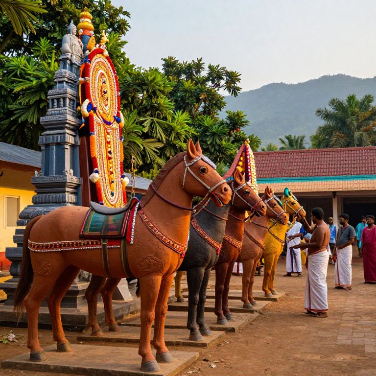 Ayyanar statue in a rural South Indian temple courtyard, large clay horses lined up, intricate decorations, villagers performing a colorful festival ritual, rich cultural setting with lush greenery and mountain backdrop, warm golden hour lighting