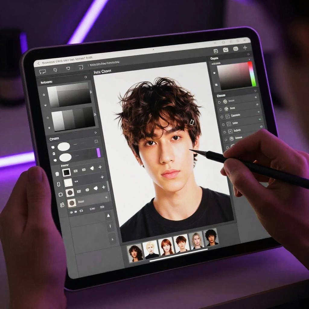 Fix hair in photo online free, showcasing a creative digital artist at work using a tablet to retouch hair in a photo, with layers, masks, and enhancement options on display, illuminated by neon accents creating a futuristic editing vibe.