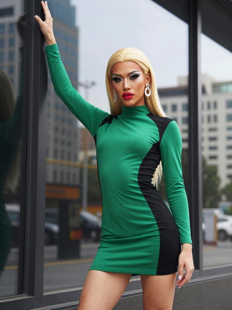 Transgender model, bold street-style fashion portrait, androgynous model with sleek straight blonde hair and winged eyeliner posing confidently with one arm raised, wearing a bodycon mini-dress in emerald green with black details with contrasting side panels, statement earrings, bright lipstick, polished makeup, blurred modern cityscape reflected in large windows behind, overcast daylight, contemporary urban fashion photography