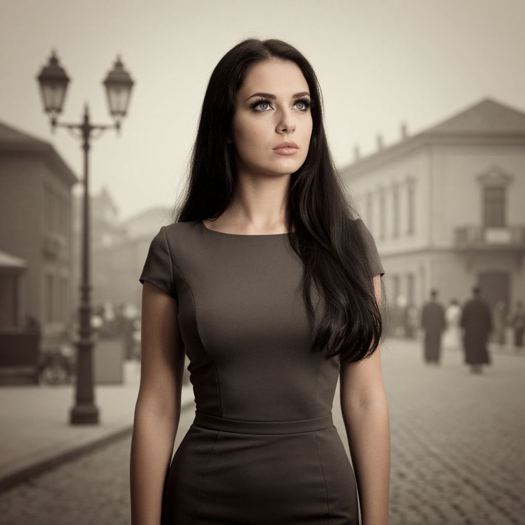 A mysterious woman with raven hair cascading down her back and piercing blue eyes framed by dark lashes stands in the foreground of a blurred vintage sepia photograph. She wears a modern form-fitting dress, creating a striking contrast against the faded background of an old-fashioned scene behind her. Subtle manipulation seamlessly blends elements from the past—old street lamps and distant figures on cobblestone streets—into her attire. Her expression is one of quiet contemplation as she ponders this unique double exposure, capturing a juxtaposition of eras. Light from an unseen source illuminates both layers, uniting them with a soft glow while maintaining depth and dimensionality that draws viewers into this captivating fusion of old and new.