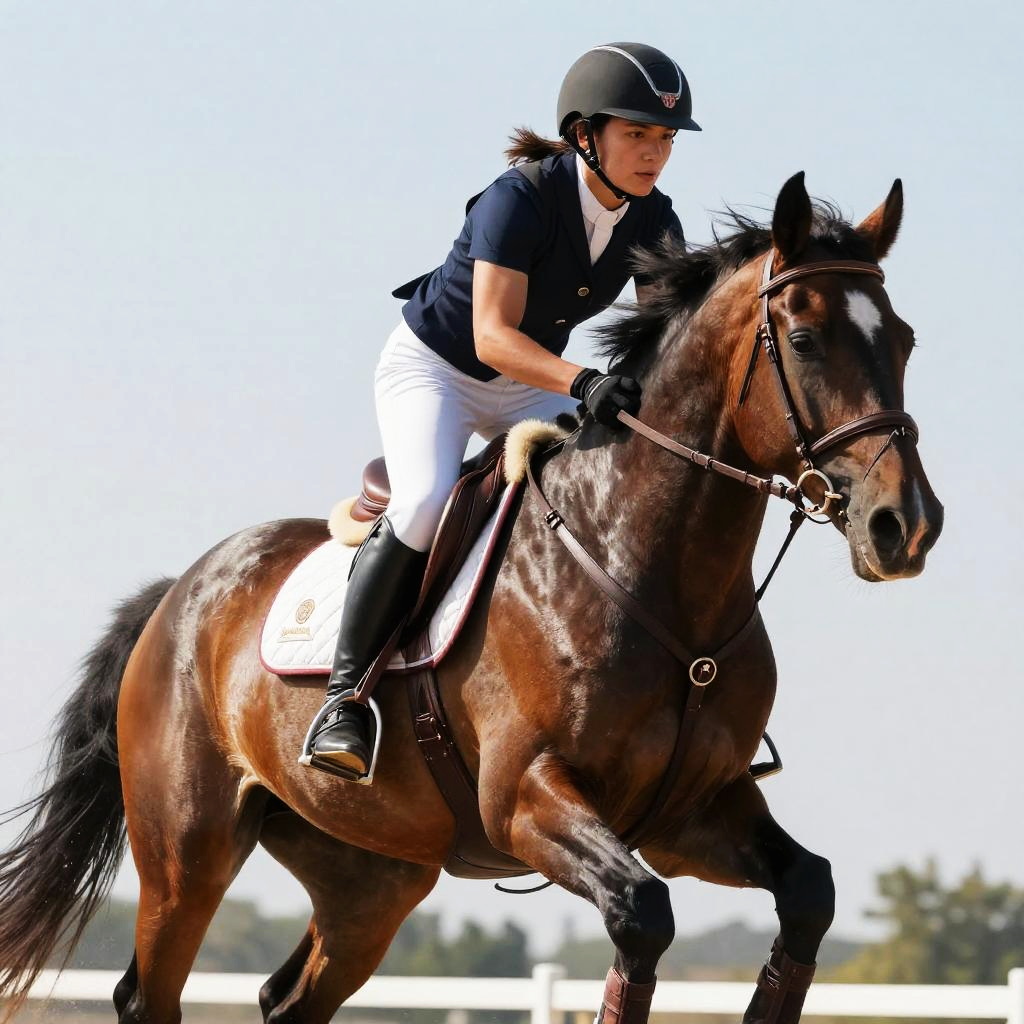 Dominant riding action shot of an experienced rider leading a horse over a challenging jump in an outdoor arena, sharp details, energetic atmosphere, vivid and dynamic composition.